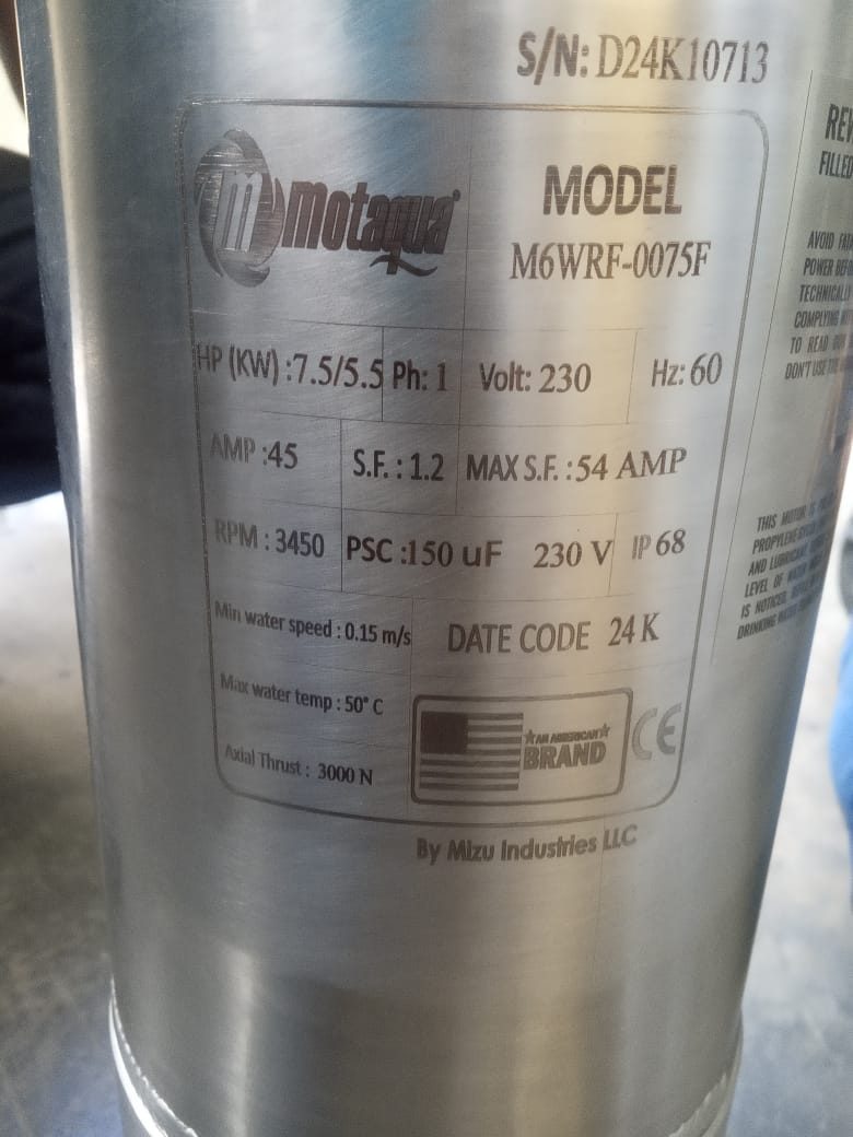 MOTOR SUMERGIBLE MF MOTAQUA 6" SERIE MKD MOD. M6WRF0075F 7,50HP 1PH/230V/60HZ/2P 3600RPM 3W DOL NEMA6 WF-R SS-304